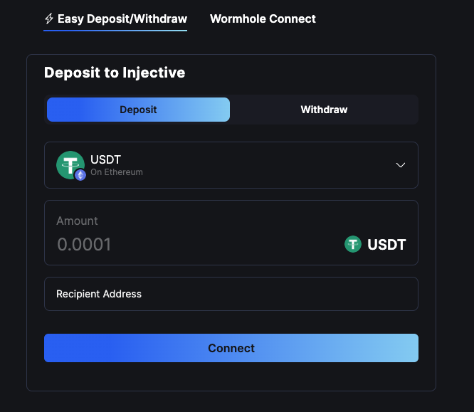 Bridge USDT and other assets into Helix via the Injective Bridge.